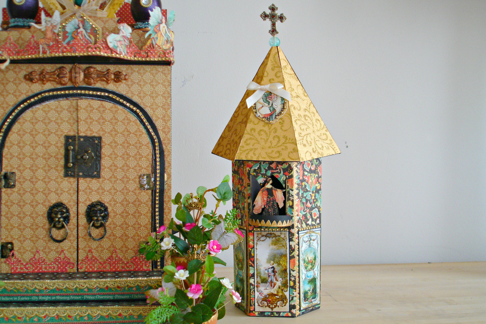 As you can see, I used a lot of the Gold Ric Rac Dresden Borders Sets to outline the corners of every seam in the towers and the stairs. The red trim balcony railing and door decorative 'molding' is from the Enchanted Forest paper pack, die cut with a Sizzix die. The ornamentation above the door is another mold I made from an architectural mold and paper clay that I had on hand.